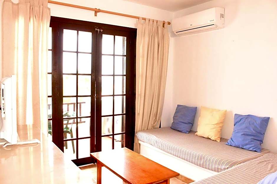Perfect location, quiet, easy walk to beach restaurants bar supermarket. Apartment was clean, balcony with beautiful views and comfortable for 5 people. Clean towels most days and pools although no sun loungers, for middle of summer holidays were not busy at all!