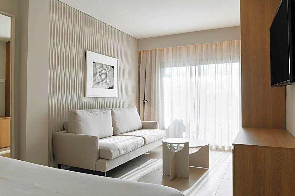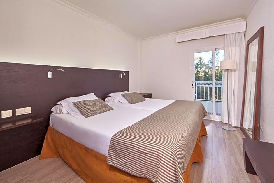 The new suites offer a unique, modern and elegant style, a design with a new flair. Custom-made to offer a great holiday with maximum comfort, both as a couple and with friends. Its surface of 549 sqft is distributed in a master bedroom integrated into the living room, a second bedroom with two single beds, a modern bathroom with a shower and a balcony to enjoy panoramic views of the hotel. It also has: Exclusive Bath Set Pillow menú Bathrobe and slippers Iron kit Pool towels Microwave Hairdryer TV satellite signal Safe (incl.)