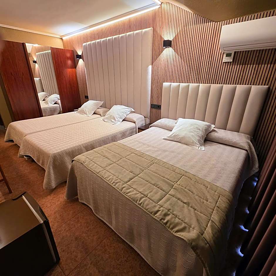 Heated triple room with 1 double and 1 single beds. This room includes a flat-screen TV, mini-bar and private bathroom with bath tub. This room accommodates 2 adults and 1 child.