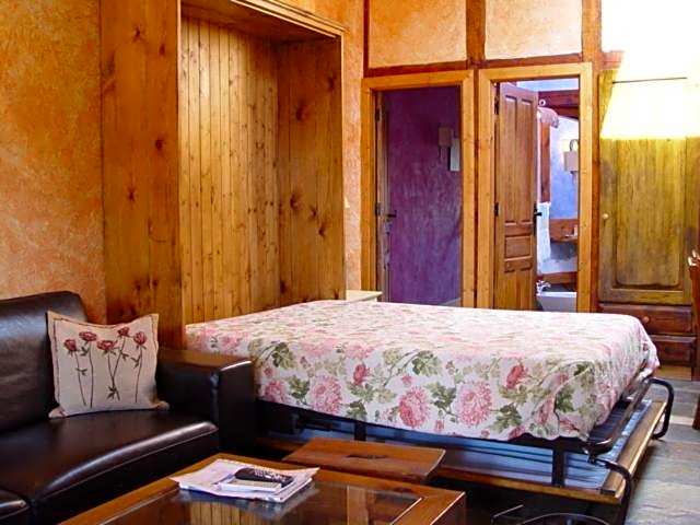 It has a double bedroom, and a seating area with a sofa, a fireplace, a TV and a fold-away double bed.