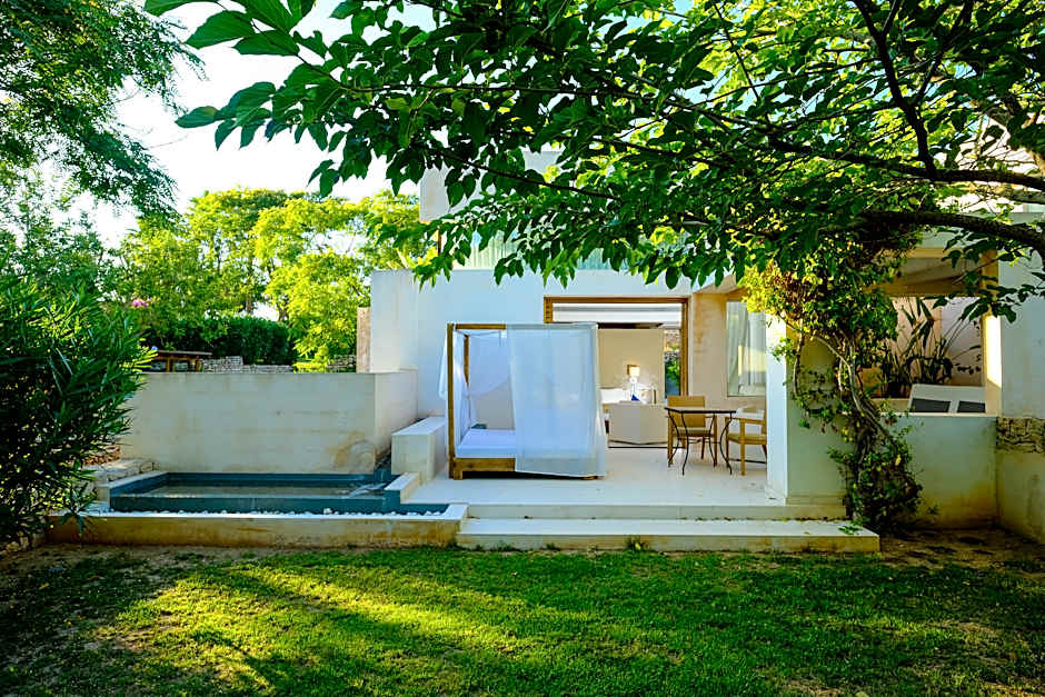 VILLA WITH PRIVATE GARDEN 2 ADULTS + 2 CHILDREN is 431 square feet and includes a king-size bed 150-183 width plus terrace, extra beds on demand, desk, hairdryer, tea and coffee making facilities , ironing set, safe, and bathrobes.