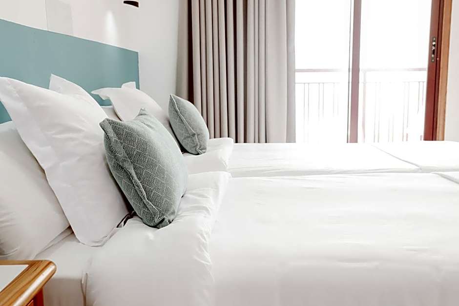 Room options span a versatile lineup of studios and apartments. Sea-view variants include Studio, 2 Twin, Sea View and Studio, 3 Twin, Sea View, each at 323 square feet, offering compact space with ocean views. For more room to spread out, the Superior Apartment measures about 410 square feet and the Superior Studio accommodates two adults and one child. The Double Room, Partial Sea View offers a different perspective, while Studio configurations also come in formats like Studio, 2 Single and Studio, Single, Sea View (the latter with a sofa bed).