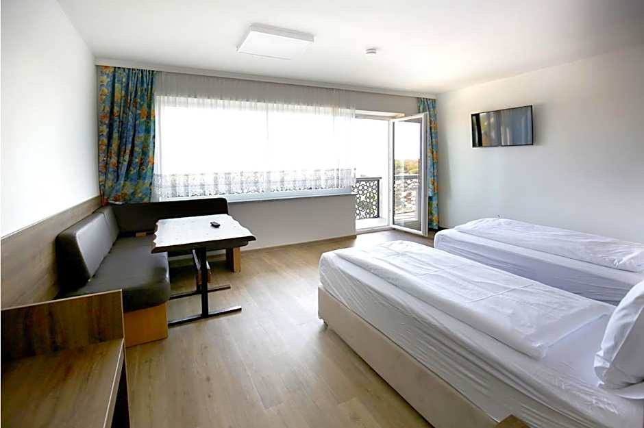 This modern duplex apartment features a furnished balcony with views of the forest. It has a seating area, a kitchenette, and a double or twin bedroom.