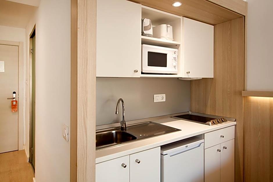 We got an upgrade offered for a good price since we got there a lil bit earlier than our check-in time. So instead of the studio we got an spacious and clean appartment on the 5th floor with an amazing view! There alot of kitchen&table ware available in the kitchen. The cleaning staff was super polite and kind. Parking was also easy around the hotel.