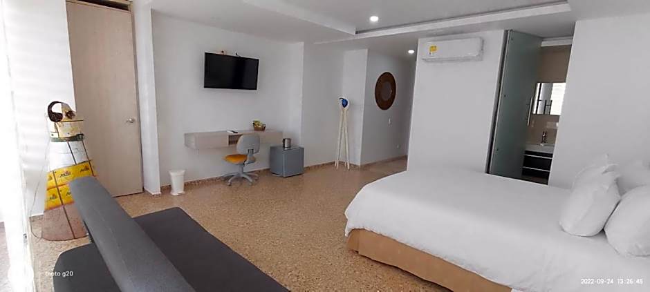 This suite has views of the Carihuela and has a Caribbean-style ceiling fan over the king size bed. There is a sofa bed for the 3rd guest, as well as a dining table. The kitchenette has a hob, mini-oven and a grill. The private bathroom has a shower, bath and hairdryer. A safe is available to rent.