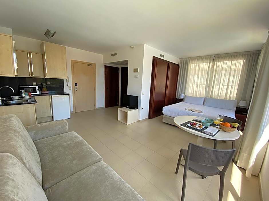 The studio offers a safe deposit box, a sofa, as well as a private bathroom boasting a bath or a shower and a hairdryer. Guests can make meals in the kitchen that features a stovetop, a refrigerator, kitchenware and a microwave. The air-conditioned studio features a flat-screen TV, soundproof walls, a tea and coffee maker, a wardrobe as well as pool views.