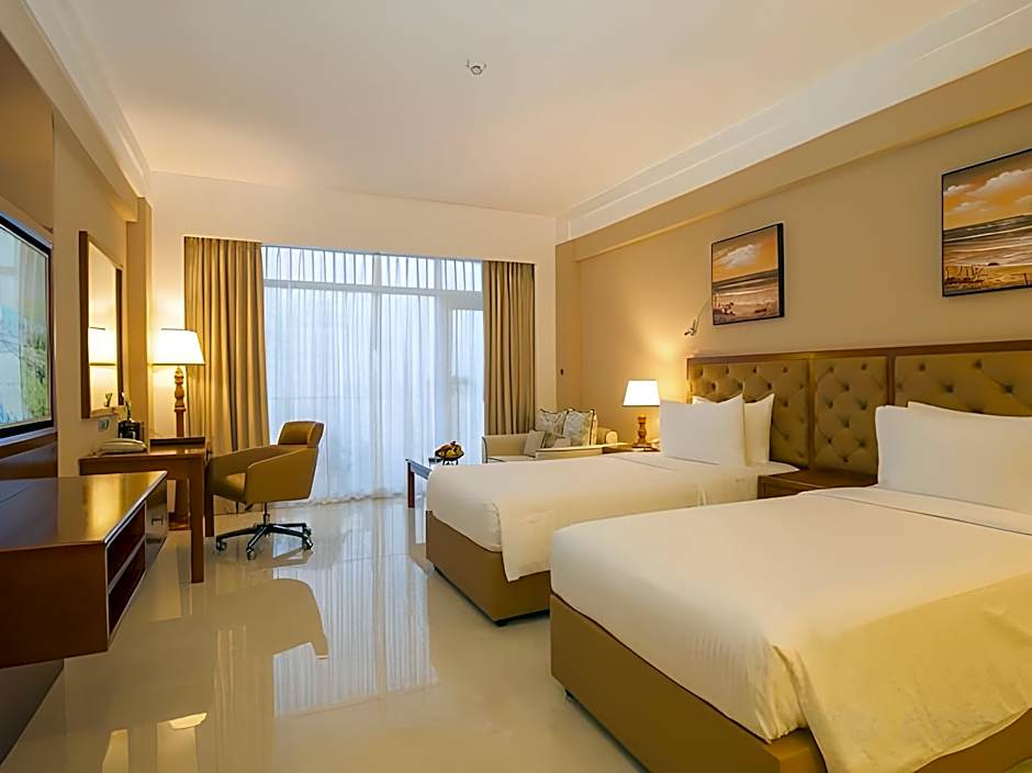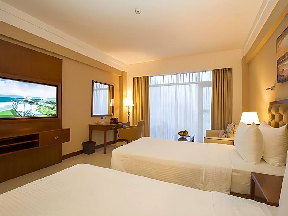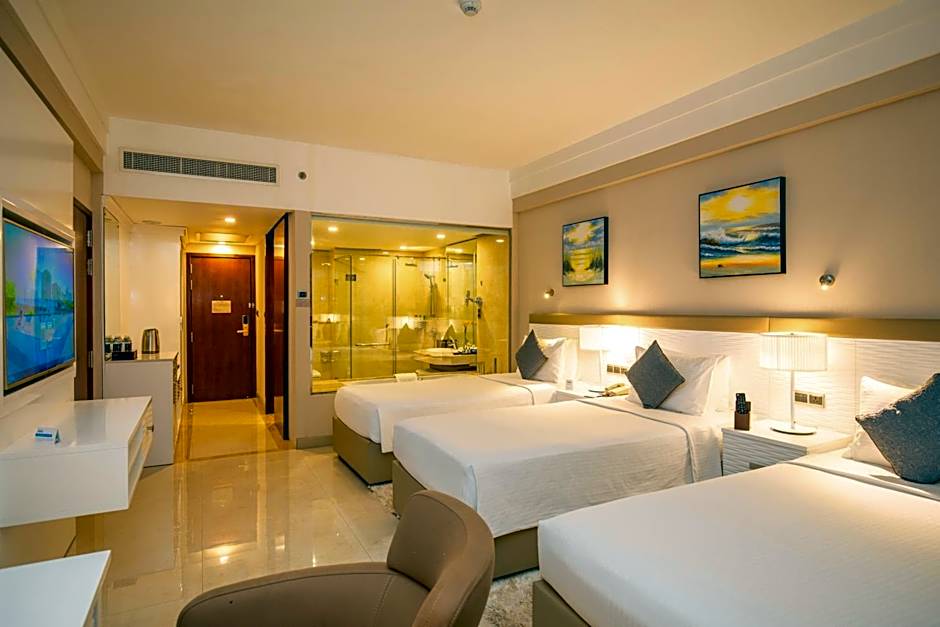 The hotel offers various types of rooms including Premier King Room, Deluxe Twin Room, Deluxe King Room, Deluxe Triple Room, Superior Twin Room, Superior King Room, Premier Twin Room, Signature Sea View King Room, Signature Plus Sea View King Room, Signature Sea View One Bed Room Suite, Signature Plus Sea View Twin Room, Signature Panorama Sea View King Room, Superior Triple Room, and Signature Sea View Twin Room. All rooms have a size of 377 sqft except for Signature Plus Sea View King Room (538 sqft) and Signature Sea View One Bed Room Suite (1119 sqft). Smoking is not allowed in any of the rooms. Room occupancy ranges from single occupancy to accommodating 3 adults and 1 child. Bed sizes include King size, Double, and Twin beds.