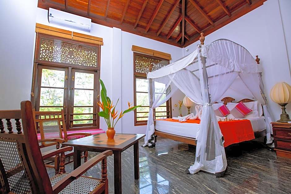 This spacious air-conditioned suite features a ceiling fan, mosquito net, mini fridge and a laptop-sized electronic safe. A comfortable seating area and private bathroom with shower and hairdryer is provided.