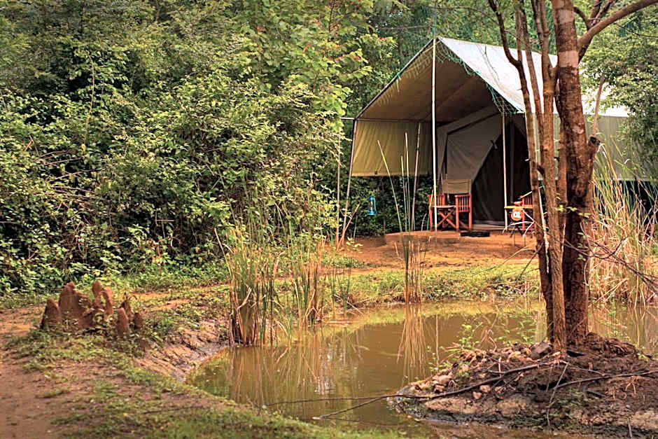 This unique tent is set on the border of the National Park faced to a pond and comes with a private bathroom. After dinner Guided Bush Walk is included free of charge. This tent features an outdoor seating area with 2 chairs and a coffee table , private bathroom with a hot shower. Includes a torch and a luggage rack. Also includes: - unlimited water - laptop and digital camera charging facilities.