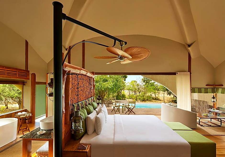 Accommodations in a climate controlled cabin with a built-in plunge pool. This cabin also features a fully stocked mini bar, laundry services(maximum 6 pieces per cabin, per day) morning & evening games and a jeep safari.
