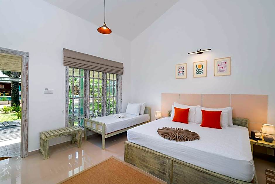 At Palmera Eco Resorts Nilaveli, guests can choose from a variety of room options. The Triple Room with Pool View is perfect for three adults and has a twin bed and a double bed. The Deluxe Double Room is ideal for single occupancy and offers a double bed. The Chalet is spacious, accommodating four adults and one child, with two twin beds and one double bed. Smoking is not allowed in any of these rooms.