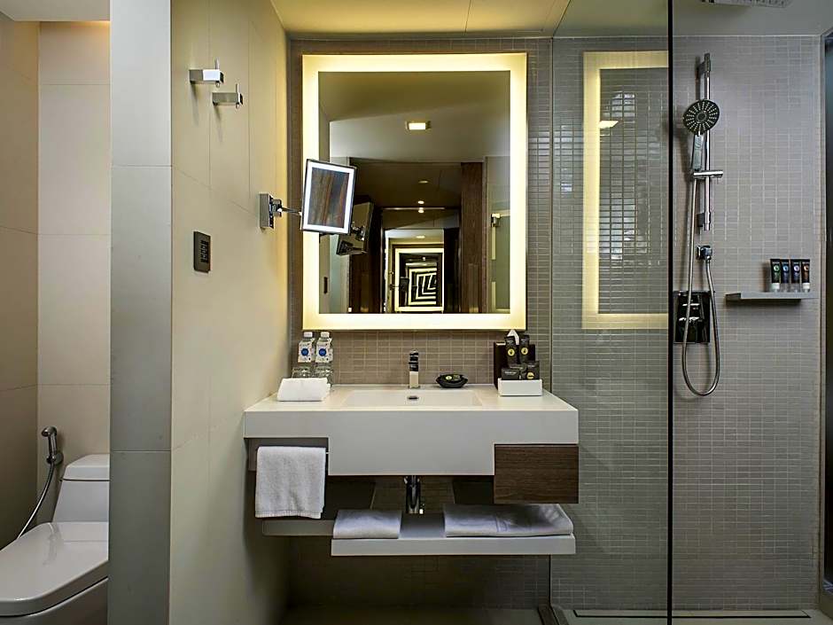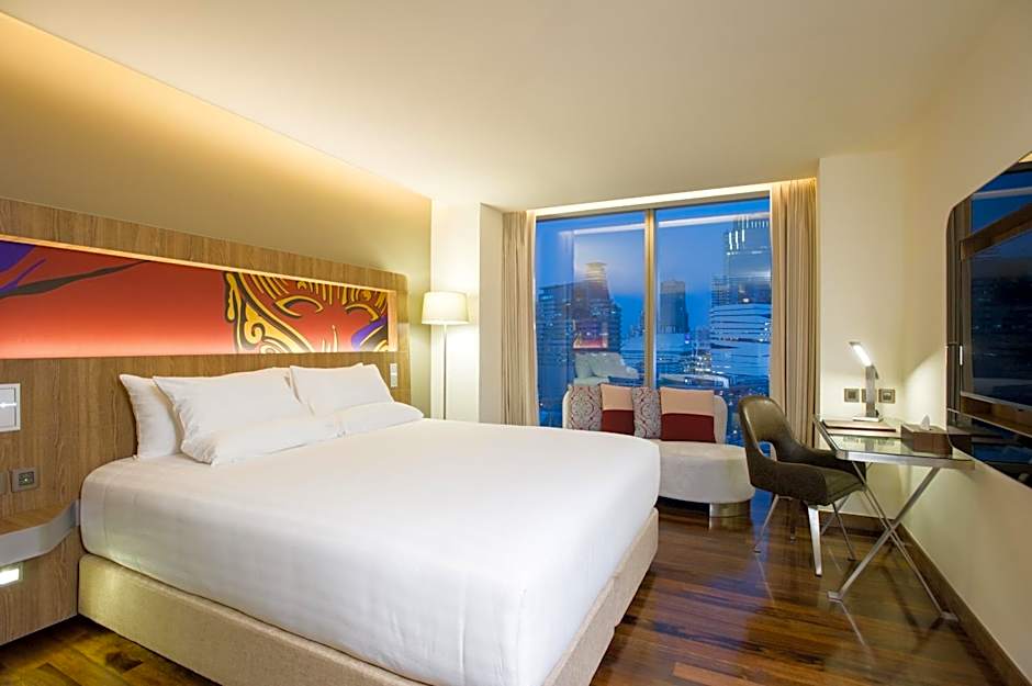 Stig ut i en inbjudande utomhuspoolmiljö. Poolområdet inkluderar en utomhuspool med en soldäck och terrass med utsikt över staden, perfekt för att njuta av Bangkoks solsken. Två pooler tillgodoser olika reserytmer: en pool endast för vuxna med utsikt för lugn avkoppling, och en pool endast för barn för energiska plask, vilket säkerställer alternativ för varje familjemedlem.