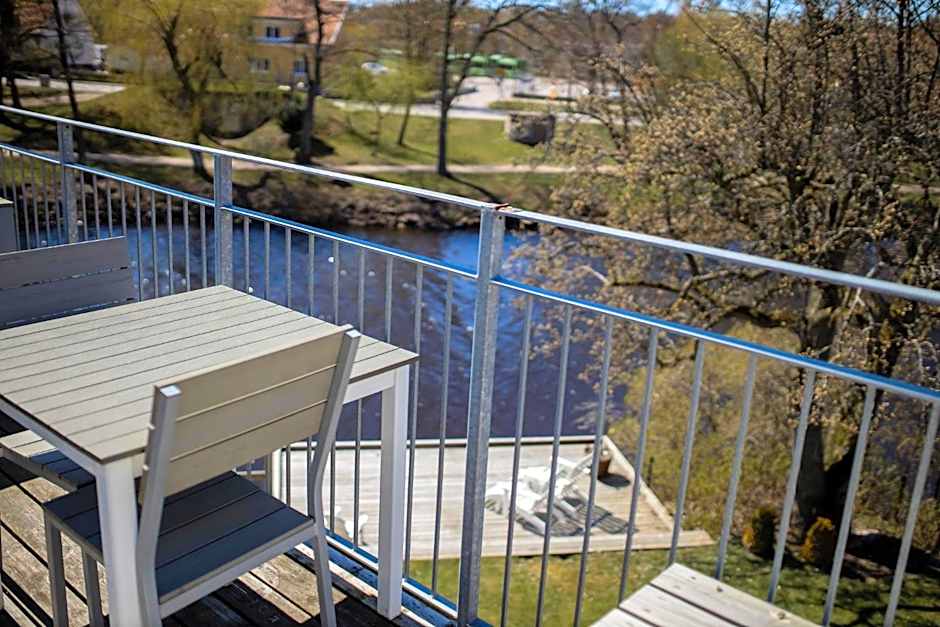 Västra Kyrkogatan 1 anchors the location in Ängelholm, Sweden, inviting guests to enjoy garden spaces and balcony options amid serene views of the surrounding garden and river.