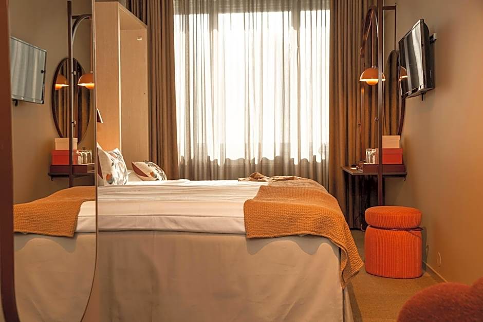 36 ft² room with a 55 in queen-size bed. Classic Nordic interior with calm tones and functional design. Includes desk, TV, blackout curtains and a private bathroom with shower, toiletries and hairdryer. Max 2 guests.