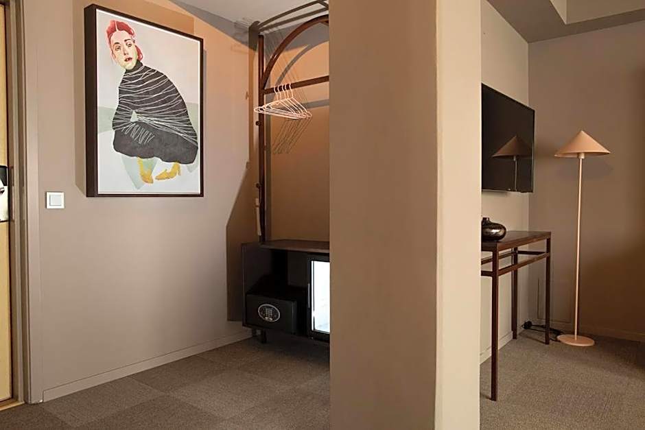 Approx. 246 ft² suite with one bedroom (2 x 35 in beds), a separate lounge with sofa and dining table for six, and a kitchenette with a capsule coffee machine. Stylish and spacious with curated interior and soft colors. The suite includes one bathroom with double sinks, toilet and shower, plus a private spa area with rain shower and jacuzzi. A connecting bedroom can be added by booking a Double Room Plus separately and contacting the hotel in advance. Max 2 guests in the suite – up to 4 guests if booked together with the connecting room.
