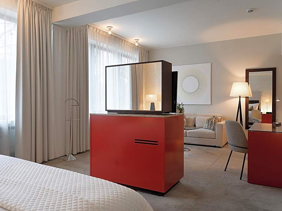 Very spacious room with a sofa and flat-screen TV. Some feature a balcony with views of Humlegården Park.