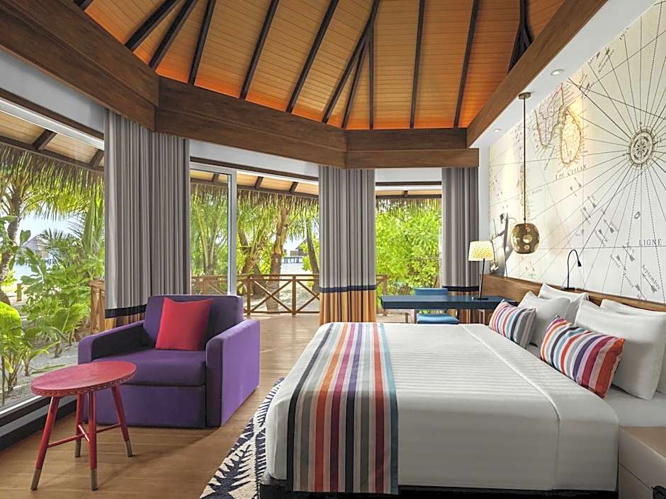 Beach Villa is 721 square feet and includes a queen-size bed 150-154 width plus extra beds on demand, desk, satellite tv , tea and coffee making facilities , safe, and bathrobes.