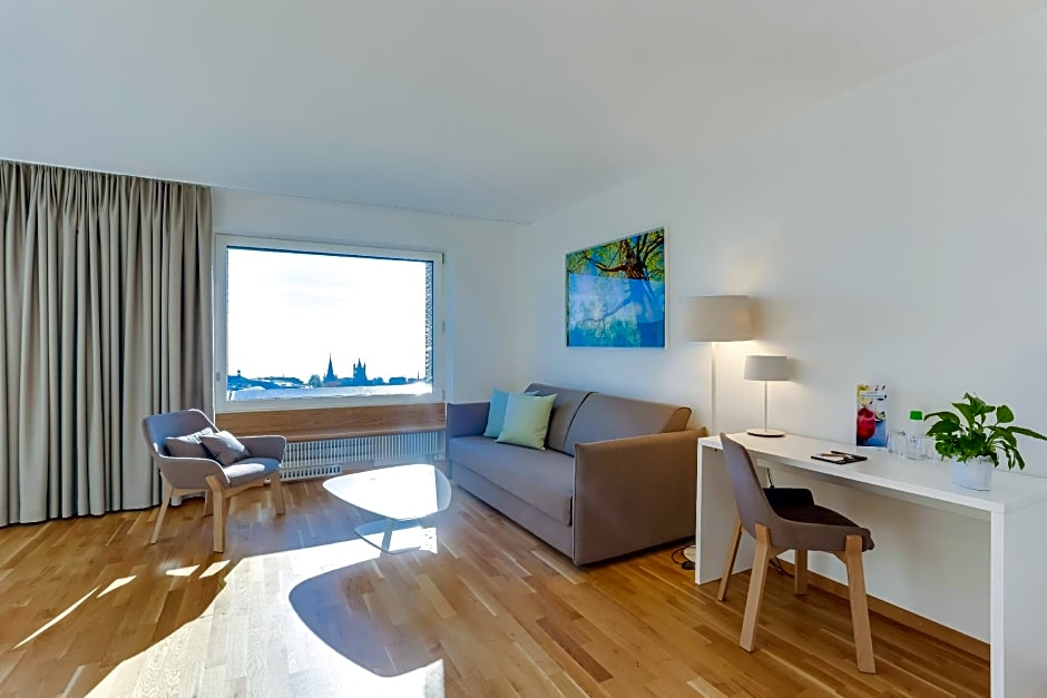 We have never been to a hotel where the staff was so warm, welcoming, and responsive to our needs. When we checked in, they provided us with free transit passes for the weekend and also let us borrow umbrellas for our stay, and no matter who was working, they treated us with real attention and kindness. Even on our last day, when we realized our early train would prevent us from sitting down to the breakfast we had paid for, they let us box up a breakfast and provided a bag as well. The room was neat and so comfortable, with a mattress that is not too hard and not too soft. The sheets were a nice natural material, and it was a nice touch to have ceramic mugs to drink tea out of, robes and slippers, and windows with a beautiful view of the lake and Lausanne. I can't wait to come back here.