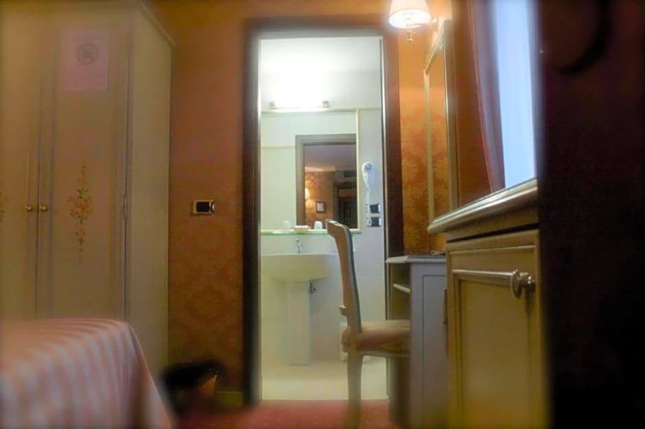 Room with a flat-screen satellite TV and a bathroom with hairdryer. Room with east-facing balcony with partial view of the Alps