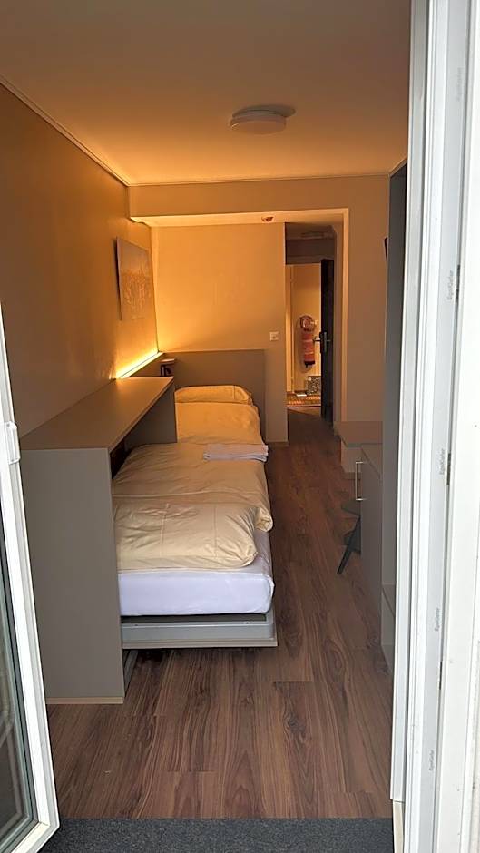 Simply furnished room with twin beds- one behind each other, a flat-screen cable TV, a safe, an electric kettle, and a bathroom. Views of the Reuss River and the Chapel Bridge.