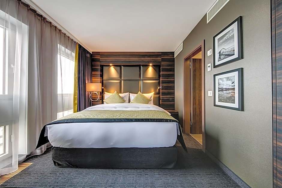Top-floor executive room with panoramic views over the Lake of Neuchâtel from the room and its rooftop terrace. The rooms are 25 to 105 ft² in size and feature eco-certified Swiss luxury beds, a Nespresso coffee machine, a free bottle of mineral water on arrival and a 42’’ LED TV.