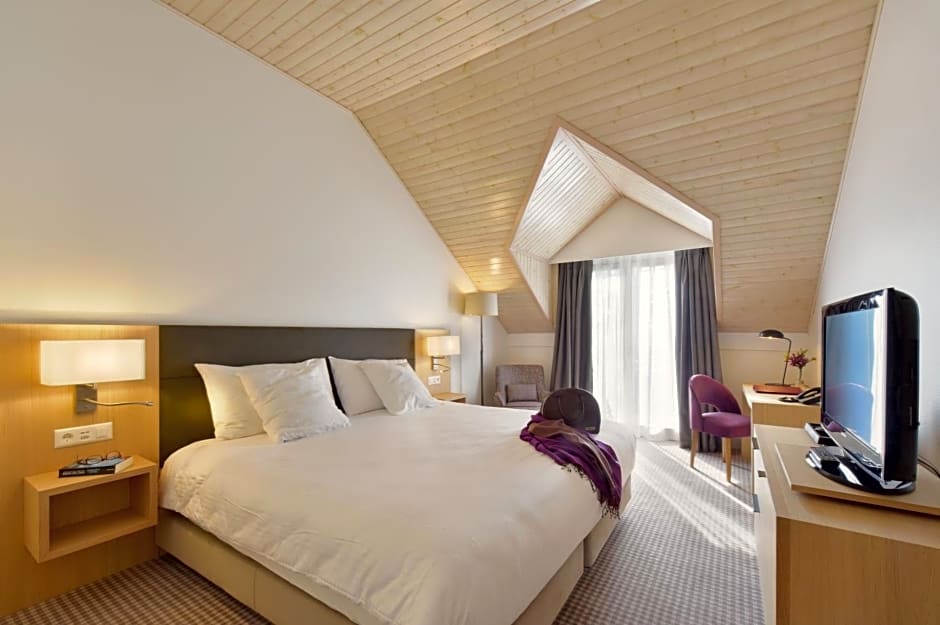 This bright suite comes with a living room, a bedroom, a dressing room, a spacious bathroom with a spa bath, a separate toilet and 2 TVs. It has either 2 balconies or a terrace with lake and mountain views.