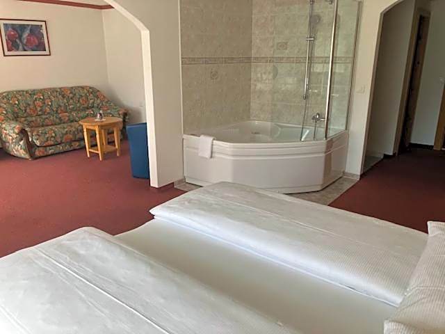 The suite features carpeted floors, a seating area with a TV, a wardrobe, a safe deposit box, as well as a sofa. The unit offers 1 bed.