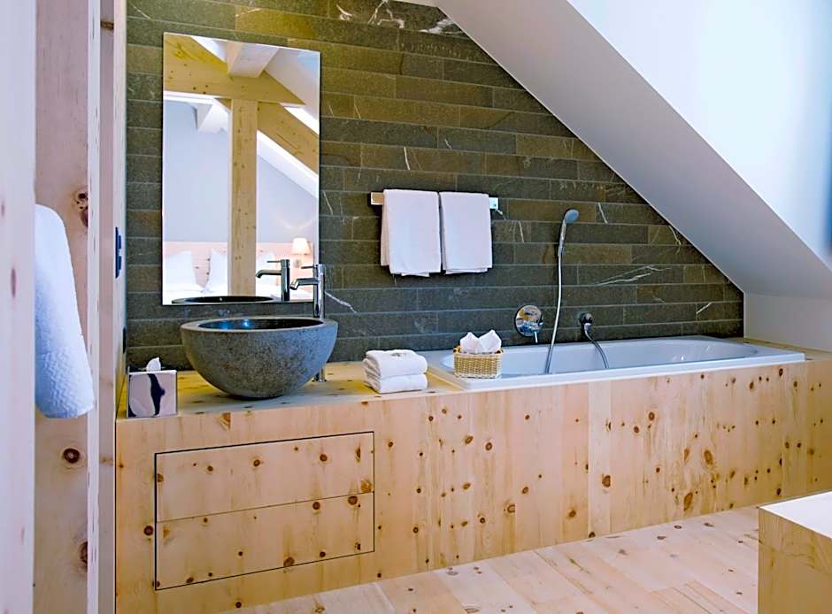The Roseg double room is a romantic room with an area of around 22 square yards. The bed consists of two 35 in x 79 in sized single mattresses placed next to each other. The Roseg also offers a comfortable seating area and an open, beautiful bathroom. Perfect for a sophisticated romantic stay for two.