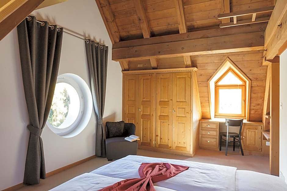 This spacious and modern room features furniture made of Swiss stone pine and comes with a TV. The room faces the woods.