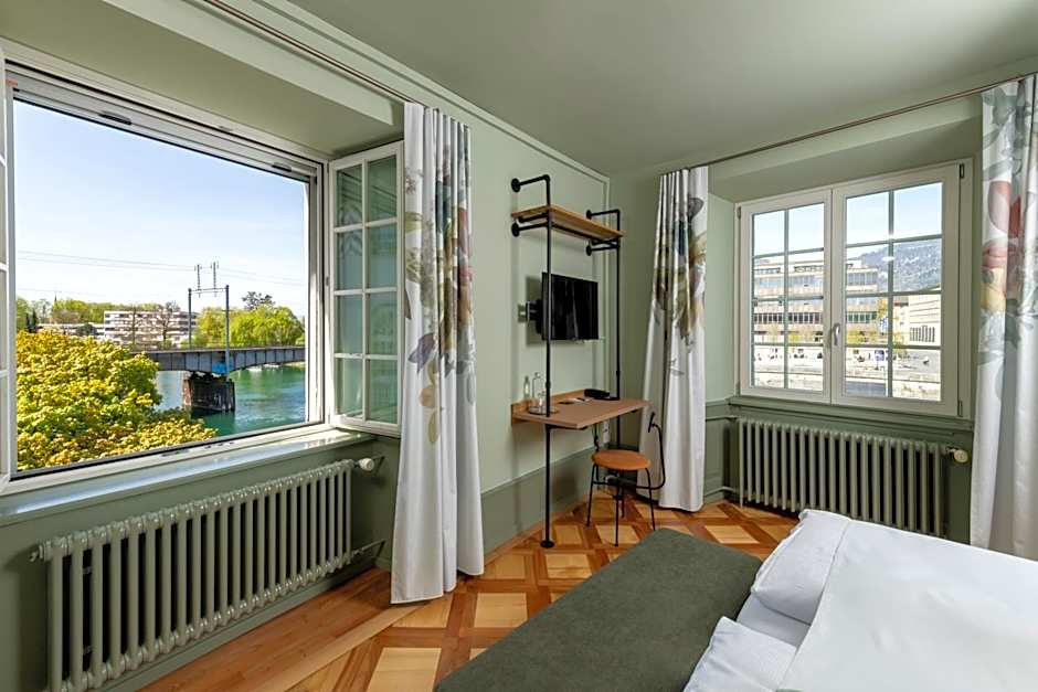 Spacious and bright rooms overlooking Solothurn and the Aare River. They feature a flat-screen TV, a seating area, and a modern bathroom. Free wired internet access.