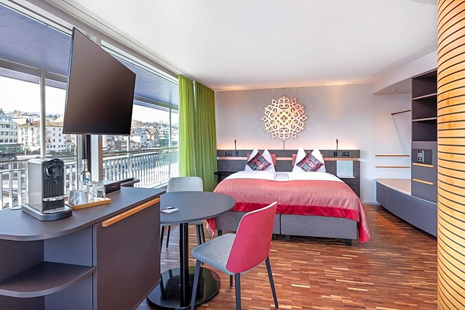 These rooms come with a large work space, a balcony, offering views of Lake Zurich, a flat-screen TV with cable channels, wooden floors and a bathroom with a hairdryer and toiletries. In addition, a mini-bar is available, as well.