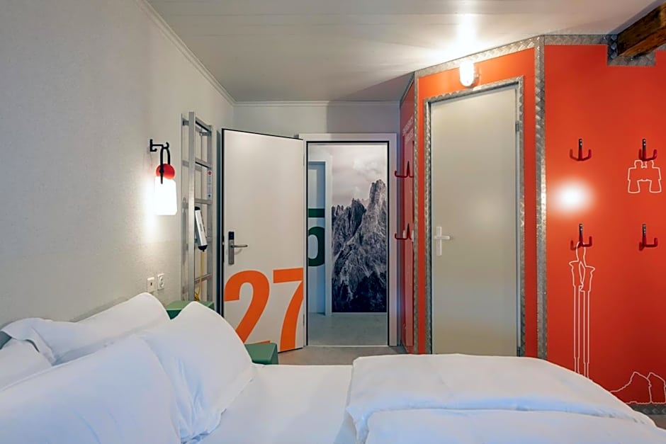 Enjoyed our stay at Peanut lodge (never got the story). Spotless, modern, fun, cheerful, functional hotel. We booked the smallest room and it was small, but did the job. Reminds me of Moxy hotels - a bit quirky, but ok. Bath was the smallest. Parking was just outside the front door in the village public square. No problem for us, during high season I wonder?? Never had a machine check me in before, but it worked perfectly and spit out a key to our room. For what felt like a basic hotel, the sauna and restaurant were excellent. Food was amazing and extremely well presented. Small menu, but it is a small hotel, so makes sense. Our window opened to the side where the Bolangerie was and we went to sleep to the smell of baking bread - Glad we were not hungry - A 1st for us and delightful! Our room was quiet even with the window open, not sure if our room had faced the uphill round-about, might not have been so quiet.