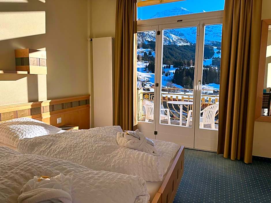 North-facing room with views towards the village and the church of Wengen.