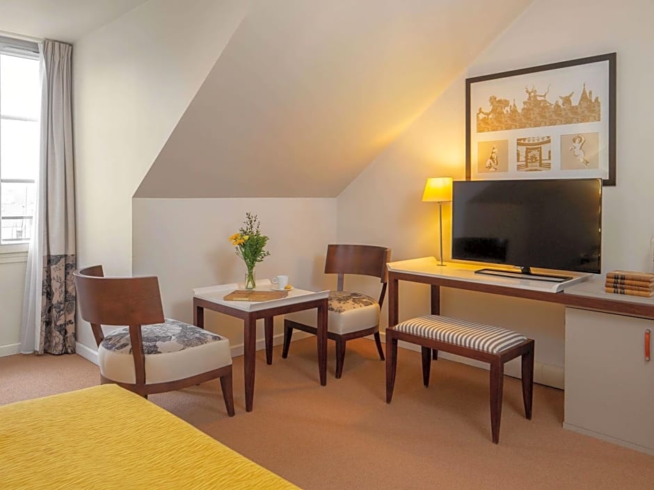 The closet containing the toilet and shower was tiny, but there was a curtain dividing the shower from the toilet. There was a separate area outside of the WC with a sink. A water cooker for tea was provided, but there were no tea bags or cups. The dual-paned windows kept out the street noise, but when I opened a window for fresh air, I could hear every footstep and syllable uttered on the street below. No breakfast was served. Nonetheless, we were happy with our stay and found the hotel to be an excellent value.