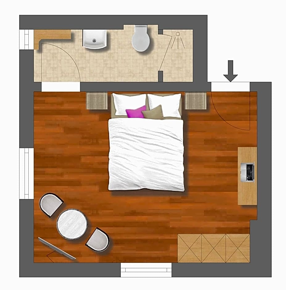 Double room with parquet flooring, a mini-bar and tea- and coffee making facilities. The shower cubicle is located in the room and there is a bathroom with a toilet.