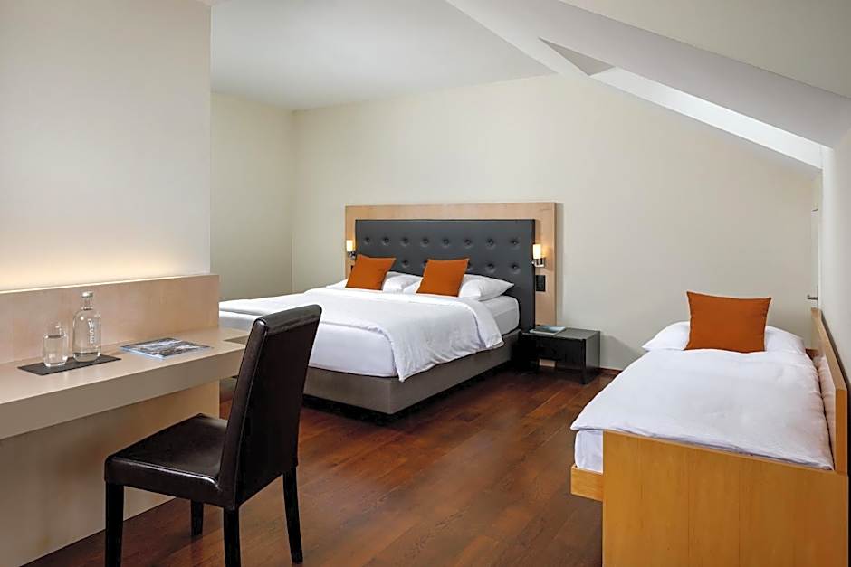 The hotel offers various types of rooms including Triple Rooms with Alps and Lake View that can accommodate 3 adults and 1 child, Panorama Rooms with different views (Countryside, City and Lake, Mountain and Lake) that can accommodate 2 adults and 1 child, Family Suites with Forest View that can accommodate 4 adults and 3 children, Skyline Suite with City View that can accommodate 2 adults and 1 child, Residence Suite with View over the Valley that can accommodate 2 adults and 1 child, Junior Suite with Alps and Lake View that can accommodate 2 adults and 1 child, Business Room with Twin beds that can accommodate 2 adults and 1 child, and Tower Suite with City View that can accommodate 2 adults and 1 child. Smoking is not allowed in any of the rooms. The sizes of the rooms range from 215 sqft to 431 sqft.