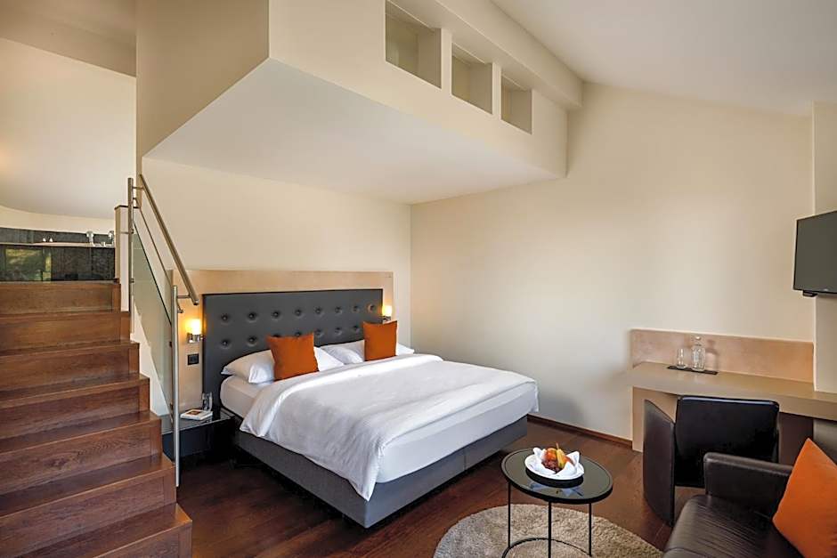 This suite doesn’t face the city but the Albis hills, the forest and mountains. The suite has a large balcony with a panoramic view, an oval spa bath as well as a starry sky design above the bed. All rooms are equipped with electric kettle and coffee machine.
