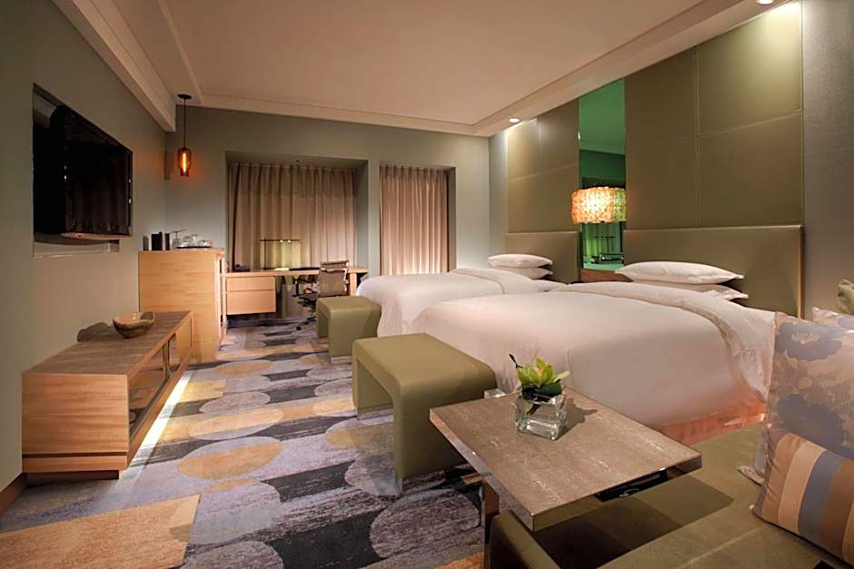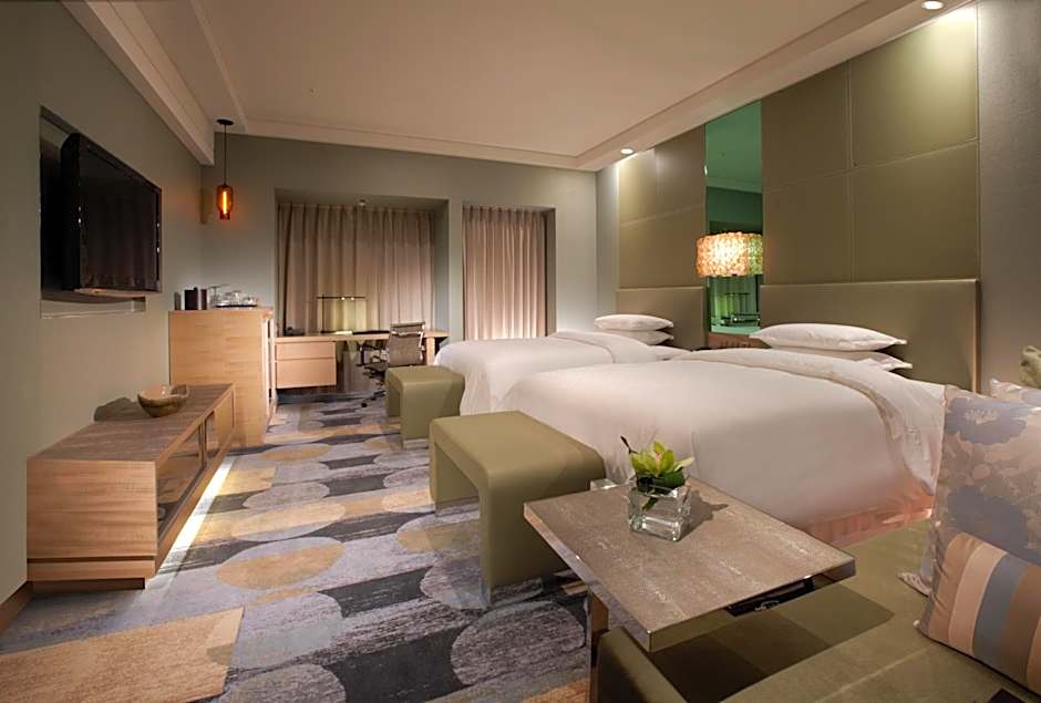 The Sheraton Hsinchu Hotel offers a variety of rooms including Standard King Rooms, Deluxe Twin Rooms, and Executive Suites. Occupancy ranges from two to four guests per room. All rooms are non-smoking and are furnished with either king or twin beds, with room sizes varying depending on the room type.