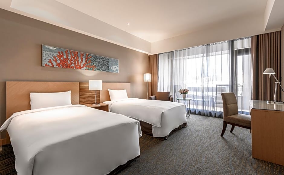 This room type provides two large beds (150*79 in), free WIFI, work desk, dehumidifier, separate shower, bathtub, electric toilet seat, and enjoy the blue sea view from the window.