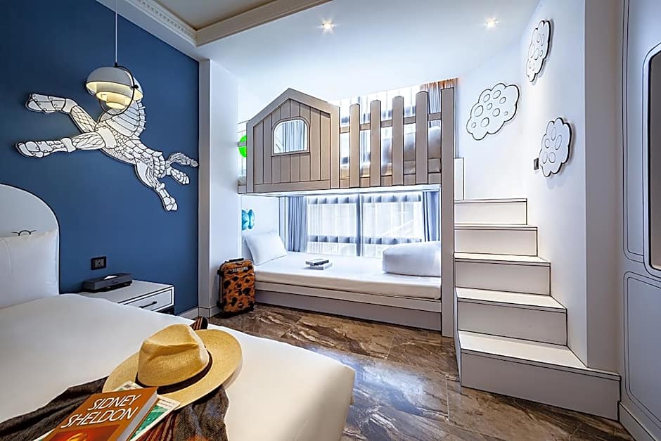This quadruple room has bunk beds, flat-screen TV, refrigerator, electronic bidet, bathtub, and air conditioning.