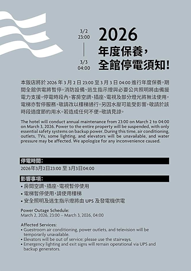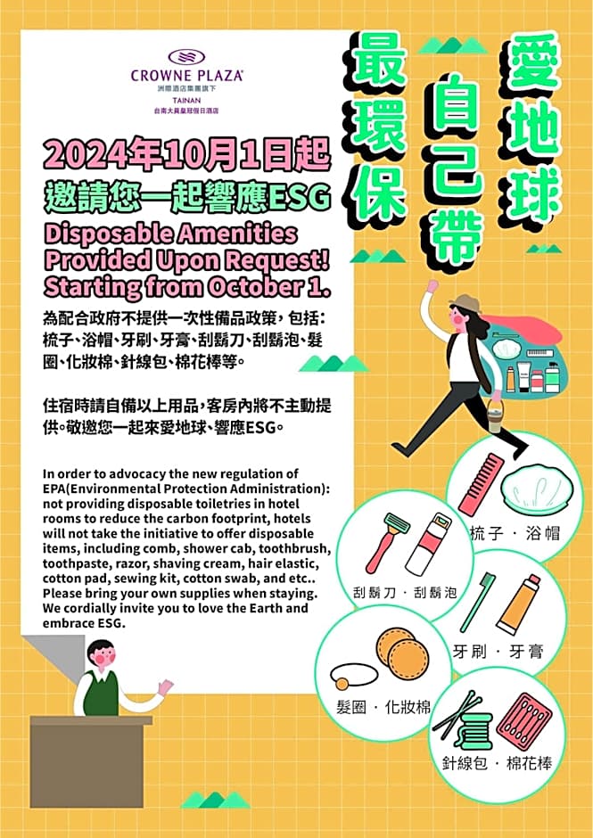 Crowne Plaza Tainan by IHG welcomes guests for check-in at 15:00 and the departure or check-out time is set at 11:00.