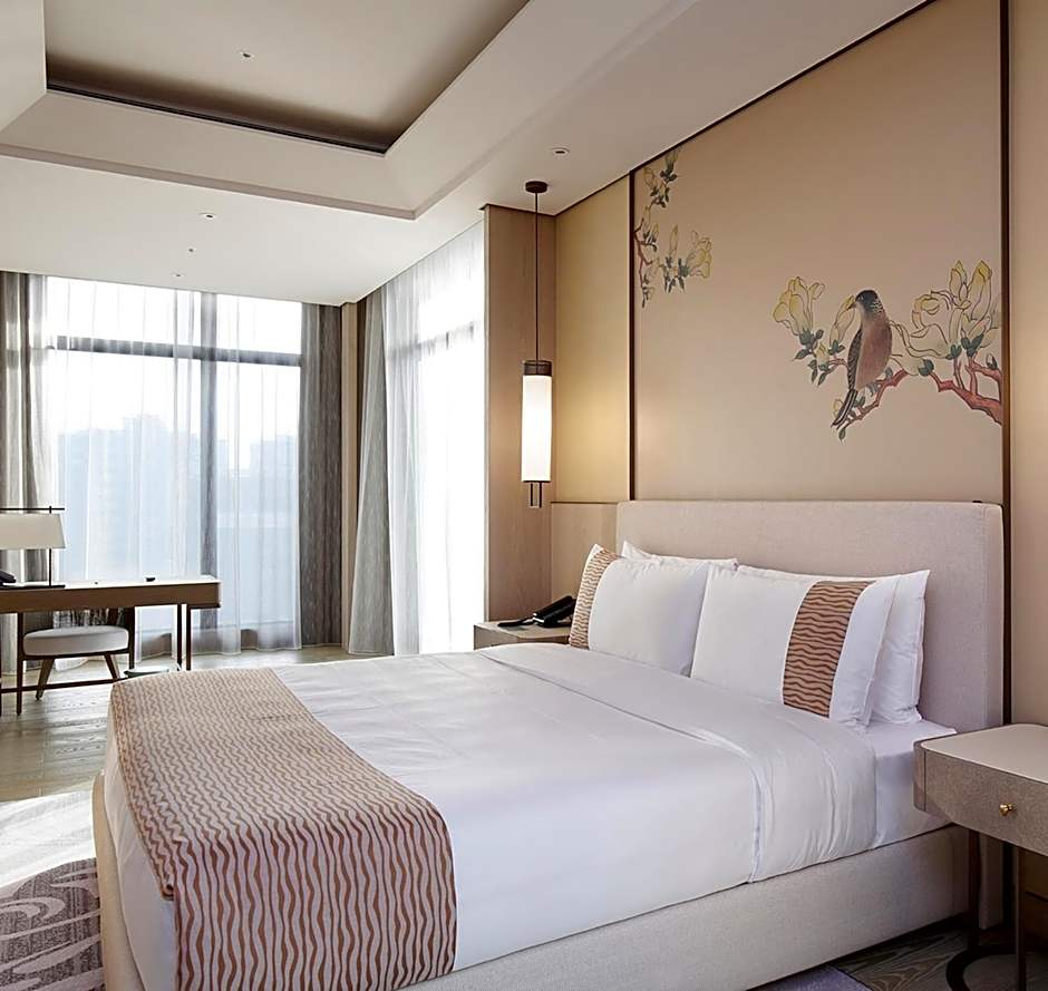 This soundproofing room has an in-room control for lighting and curtain, individually controlled air-conditioning, signature beddings, independent walk-in closet, cordless phone, full-size work desk, electronic personal safe, quality audio system, dual-voltage power socket, branded 55-inch 3D smart TV and a blu-ray DVD player on demand. Luxurious branded toiletries and Japanese-style bathrobes are provided in marble bathroom. Fresh fruit, freshly brewed coffee and mini-bar are also available.