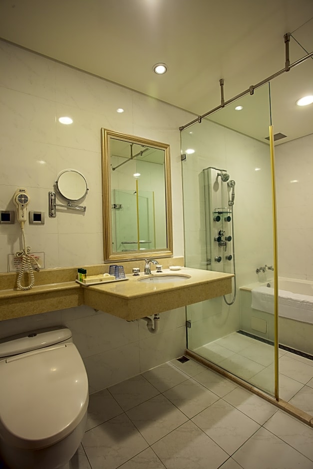 Located on the 8th floor, this spacious room features French windows and a living room. It also comes with a personal safe, tea/coffee making facilities and flat-screen TV with satellite channels. The private bathroom comes with a bath tub and a bidet. Extra bed is available at an extra cost.