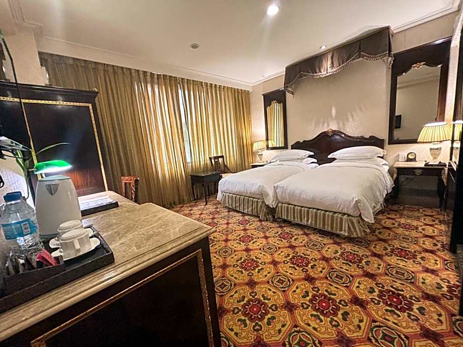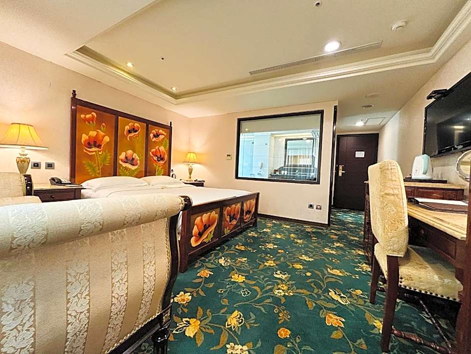 The corner room features beautiful and unique carpets with floral prints. The private bathroom has a spa bathtub, imported toiletries and bathrobes.