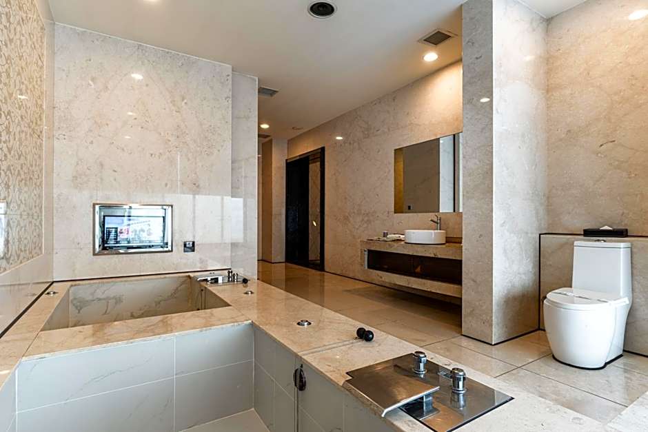 Spacious suite features a private swimming pool, a wooden sauna. Includes an additional TV in the bathroom and a balcony.