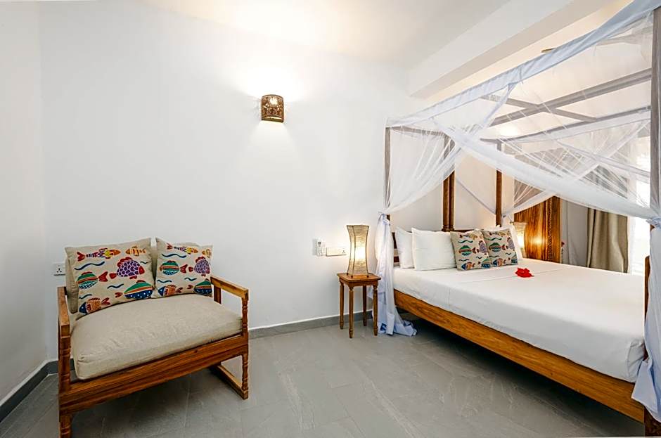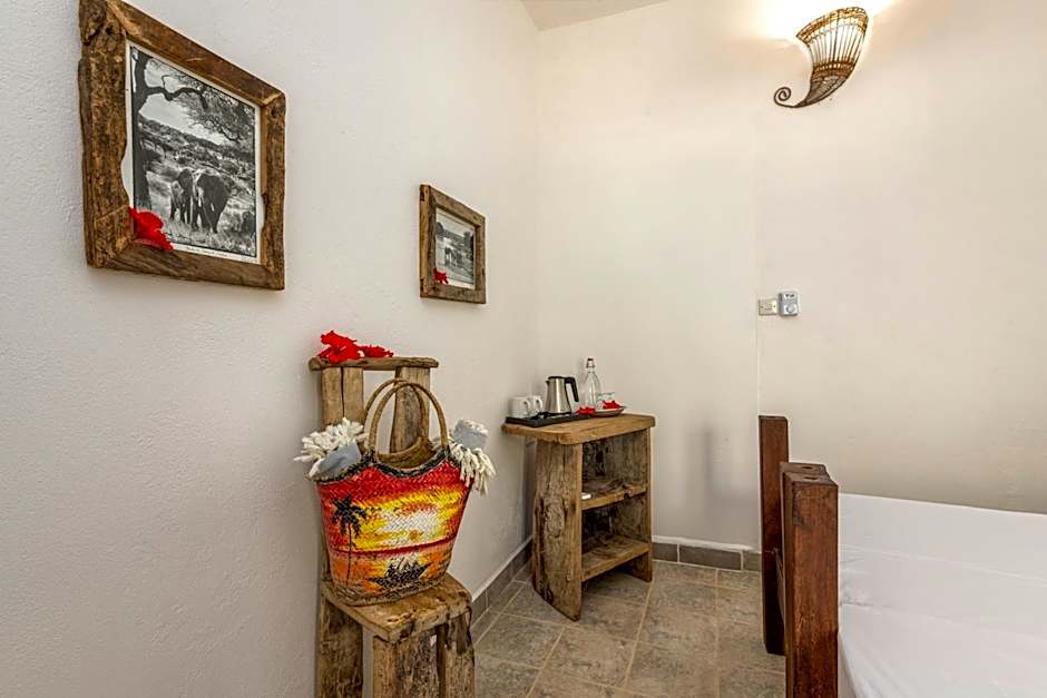 This ground floor sea view room has a furnished outdoor terrace with direct access to the beach and can accommodate up to 2 people. It is decorated in a bright, modern Swahili style with sea view and has an private bathroom with a shower and bidet.