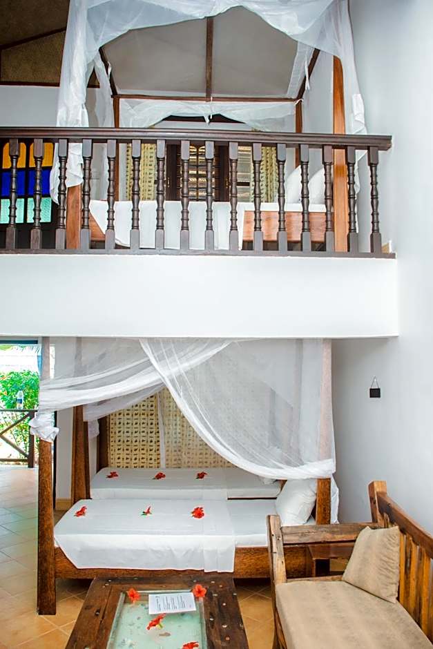 This air conditioned room features a wooden 4-poster bed with mosquito net, a refrigerator and tea-and-coffee-making facilities. There is a small living room with couch and coffee table that leads out to a balcony with hammock and views of the Indian Ocean.