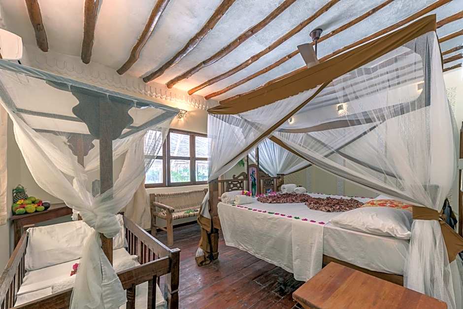 At Hakuna Majiwe Beach Lodge Zanzibar, guests can choose from Double Rooms with either Ocean or Garden Views or Deluxe Family Rooms with Ocean Views. The rooms can accommodate 2 adults in the Double Rooms and up to 4 adults in the Deluxe Family Rooms. Bed sizes vary between Queen size and King size beds, and smoking is not allowed in any of the rooms.