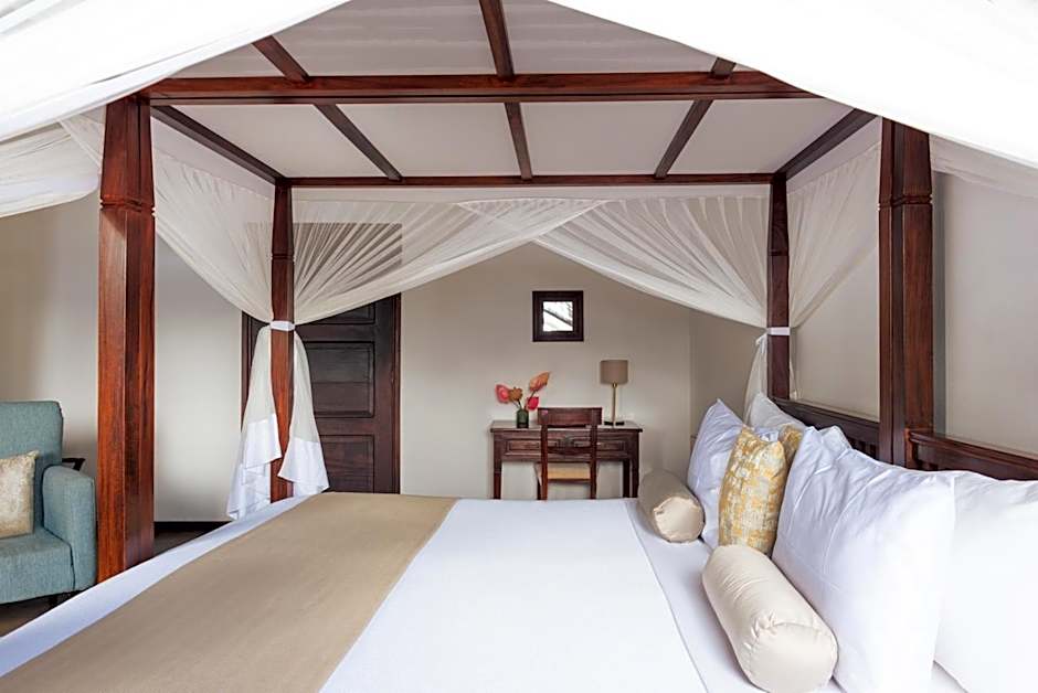 This spacious, air-conditioned suite is equipped with a flat-screen TV with satellite channels, a seating area with 4 sofas, mosquito nets, a mini-bar and a telephone. The bathroom contains a spa bath with free toiletries.