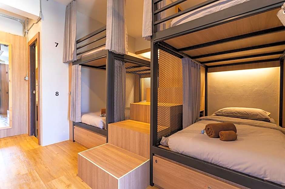 The hotel offers Queen Rooms with Balcony, One-Bedroom Suites, and 8-Bed Mixed Dormitory Rooms. The Queen Rooms have a bed size of Queen, while the One-Bedroom Suites have a bed size of King and also feature a sofa bed. All rooms have a non-smoking policy. The Queen Rooms and Suites can accommodate 2 adults and 1 child, while the Dormitory Room can accommodate 8 adults.